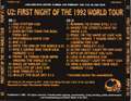 Comments: Live debuts of Zoo Station, The Fly, Even Better Than The Real Thing, Mysterious Ways, One, Until The End Of The World, Who's Gonna Ride Your Wild Horses, Tryin' To Throw Your Arms Around The World, Ultra Violet, and Love Is Blindness. First time U2 covered Satellite Of Love in full, though Bono had snippeted it a few times during Bad in the 1980s. Bullet The Blue Sky and Desire are distinctly different to past live versions. The former is even more hard-rocking than it was on the Joshua Tree and Lovetown tours and features a longer solo. The latter has completely different guitar effects, and during the song, Bono plays the role of Mirrorball Man, a parody of US televangelists.